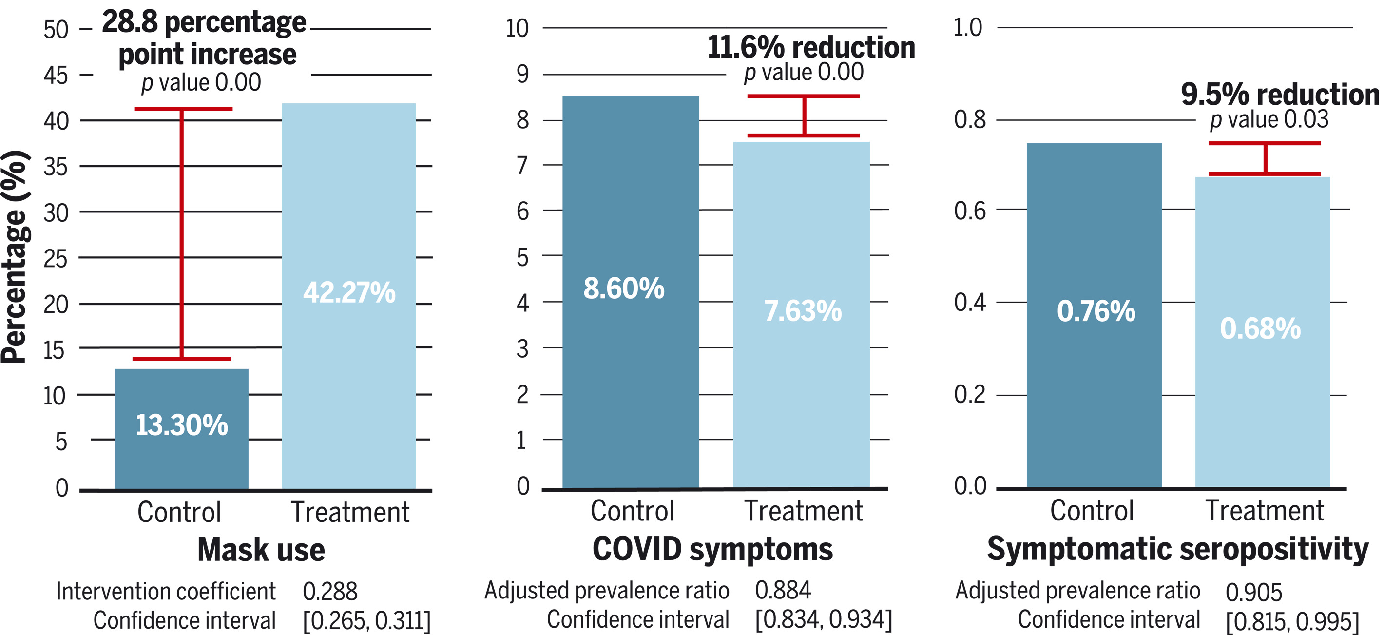 We find clear evidence that surgical masks lead to a relative reduction in symptomatic seroprevalence of 11.1% (adjusted prevalence ratio = 0.89 [0.78, 1.00]; control prevalence = 0.81%; treatment prevalence = 0.72%). Although the point estimates for cloth masks suggests that they reduce risk, the confidence limits include both an effect size similar to surgical masks and no effect at all (adjusted prevalence ratio = 0.94 [0.78, 1.10]; control = 0.67%; treatment = 0.61%).