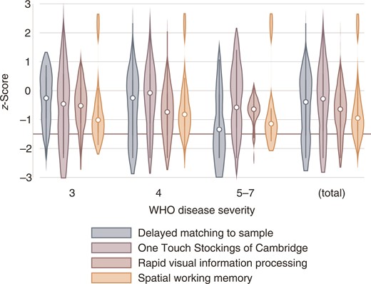 survivors after hospitalization for COVID-19 scored lower than norms on the selected cognitive tests of short-term memory, working memory, attention, and executive function. Although the reductions in general were small, for these domains 14%–25% of the patients had scores suggesting impairment, defined as z -score < −1.5, compared to 6.7% as expected from the norm population. Those with severe COVID-19 scored lower on the DMS task than non-oxygen-treated patients.