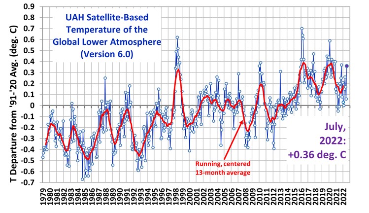 Satellite data are the most reliable we have and least susceptible to faking by the climatistas. The latest data show an increase of 0.36° C in July 2022 from the 1991 to 2020 average. To Put this in perspective, the deviation in most places from night to day is 10 to 20°C