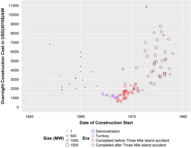 Cost in the United States versus construction start date. Notice the rapid increase due to the political activism after 3 mile island.