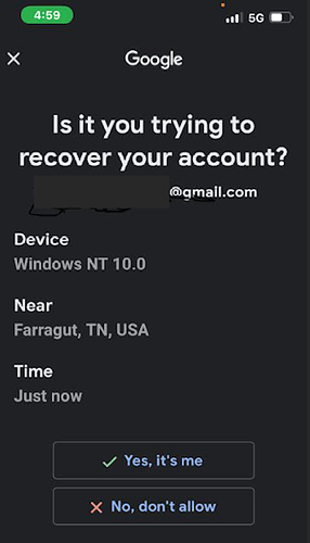I never understand in all these stories why the victim never checks whether their account is actually hacked or not. My first reaction would be to independently go to a browser and try to log into my google account, and assuming I can, review my account activity, then if anything looks off, change the password. If I cannot log into the account, then I’ll initiate the account recovery without “google’s” help. But why click Yes on account recovery if you have not lost control of your account? People just click shit without thinking it seems to me.