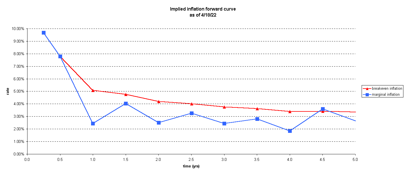 Then I bootstrapped the breakeven inflation rate for the first 6 months, together with the breakeven inflation for the whole first year, to find out how much inflation was happening the 2nd 6 months, etc (carefully for compounding). This is the forward curve for inflation expectations. The red line is the breakeven inflation curve from the last graph, and the blue line is how much the annual inflation rate is for each 6 month period ending on the time given. So the first 6 months is expected to be 8%, then the 2nd 6 months is expected to be 2.5%, etc. Normally you’d smooth this, but good enough for government work.