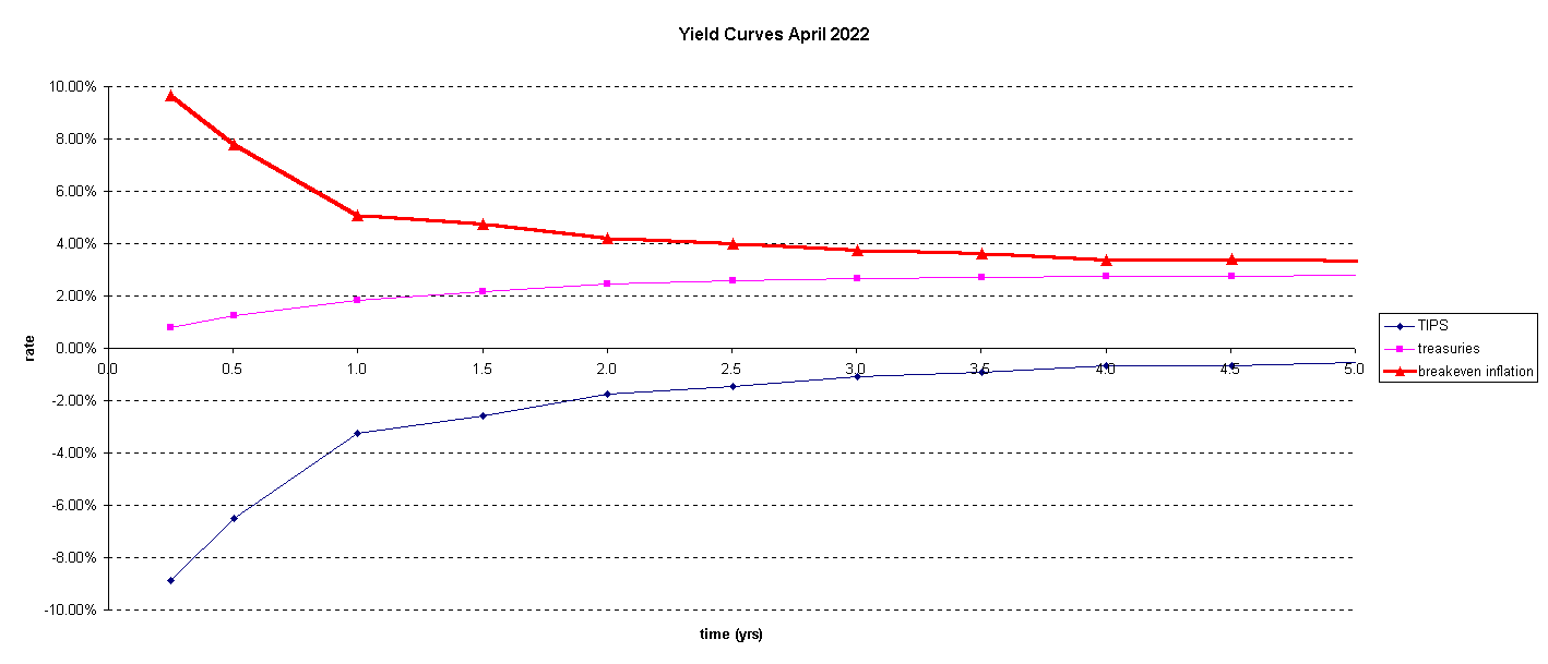 First I looked up the treasury and TIPS yields for the various maturities from 0-5 years, linearly interpolating if there wasn’t an exact bond with the right maturity. Then I subtracted these, ie Treasury - TIPS for the same maturity, to get the breakeven (market expected) inflation.