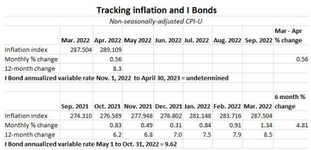 I bond owners got 0.56% for April’s CPI towards the next 6 month semiannual interest period. This corresponds to roughly a 7% annualized inflation rate in this first look into the future of rates after the 9.6% rate ends.