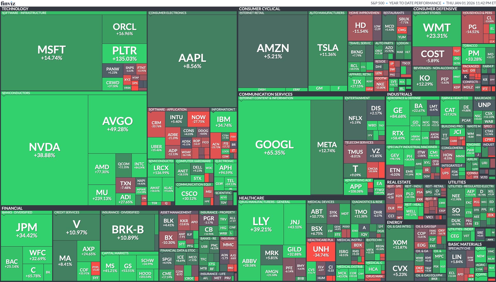 Annual 2025 winners, noting those big green squares for Big Tech and AI related stock (GOOG, NVDA).