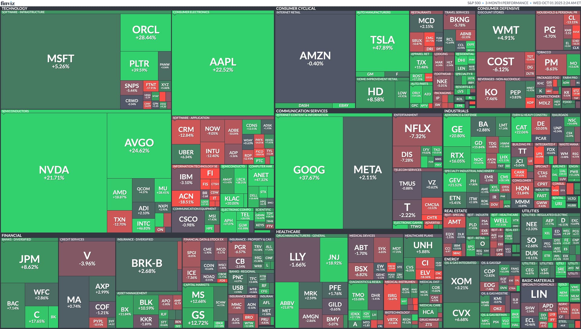 Gold has really shined as markets have become more skeptical of the US’s fiscal responsibility (look - a shutdown!) and the prospects of future rate cuts has made gold more attractive on a relative basis. Enthusiasm for risky stocks such as small caps and emerging markets has been strong this quarter, especially in the junkier or highly shorted stocks, and all of these overtook their larger peers. Still, there were gains all around, just a question of how much: