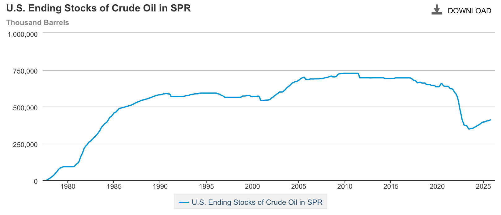 Here are amounts since reserve opened. See https://www.eia.gov/dnav/pet/hist/LeafHandler.ashx?n=PET&s=MCSSTUS1&f=M You can see the drawdown by the Biden regime.