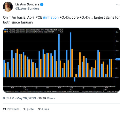 Core PCE is now up 4.7% year-over-year. It’s been 0.3% or higher month-over-month in each of the first four months of 2023, with no real sign of slowing. Also Friday, it was reported that April Personal Spending rose 0.8% versus expectations on Wall Street for an increase of 0.4%.*