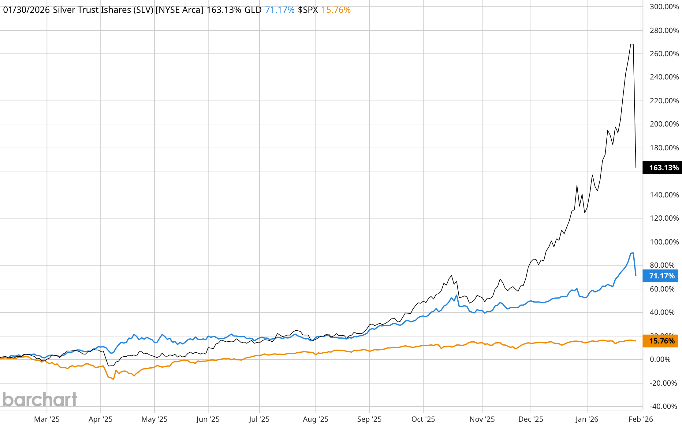 Spot gold dropped as much as 6.3% to just under $4,100 per troy ounce, its largest intraday drop since 2013. Silver also tumbled more than 8% in its worst day since 2021.