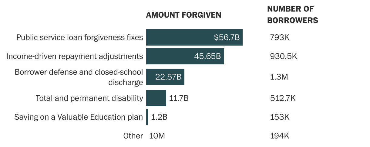 To be fair, I don’t mind too much the forgiveness of some of these that were essentially promised to borrowers but never delivered due to a (deliberately?) messed up system. Public service loans and income-drive repayments might fit under that.