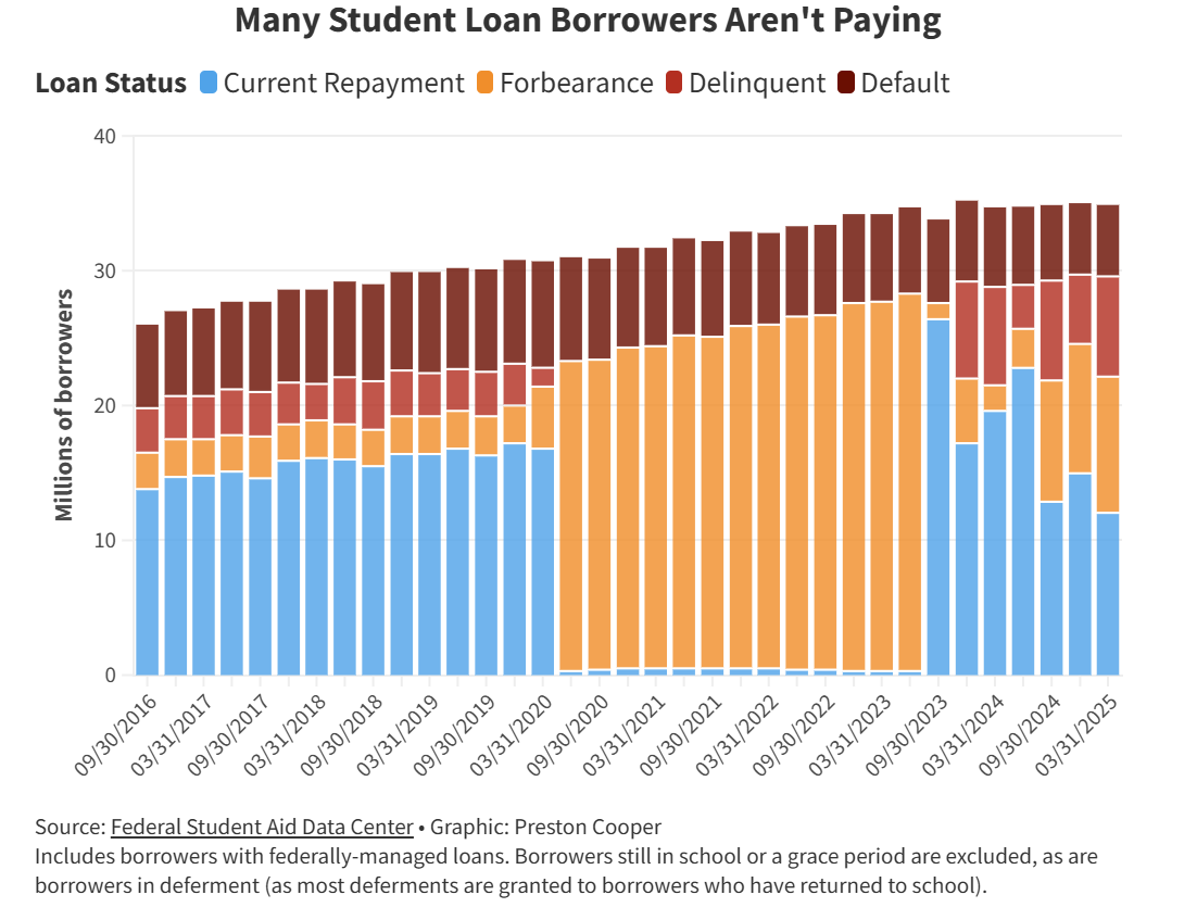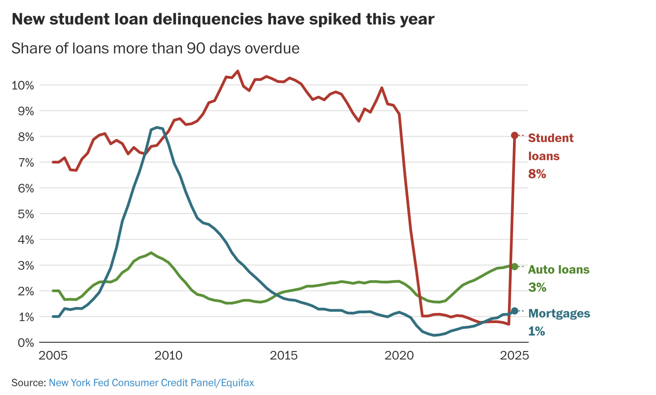 Credit scores dipped by more than 100 points for 2.2 million delinquent student loan borrowers, and 150 points or more for more than 1 million in the first three months of 2025, according to an analysis by the Federal Reserve Bank of New York