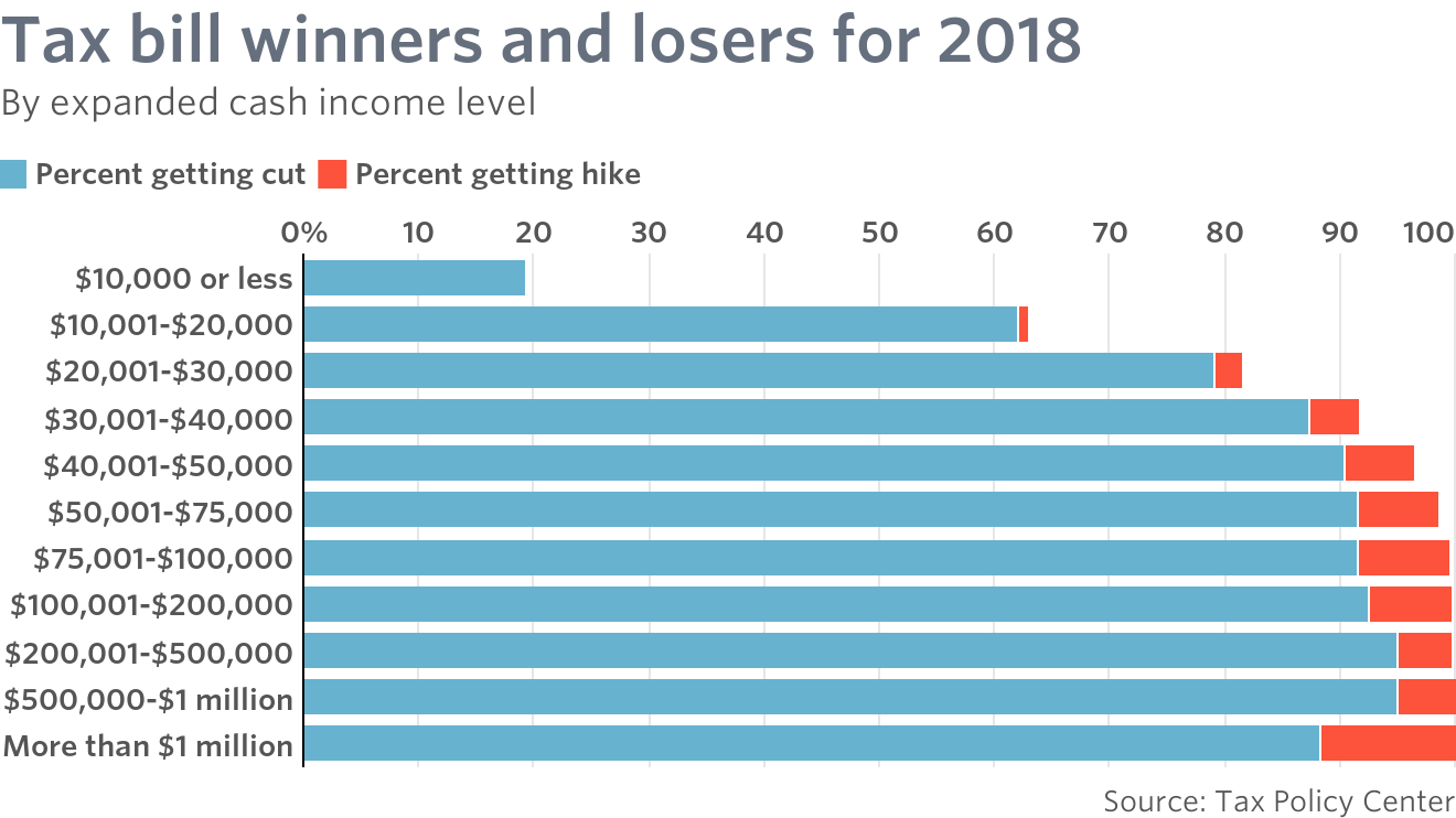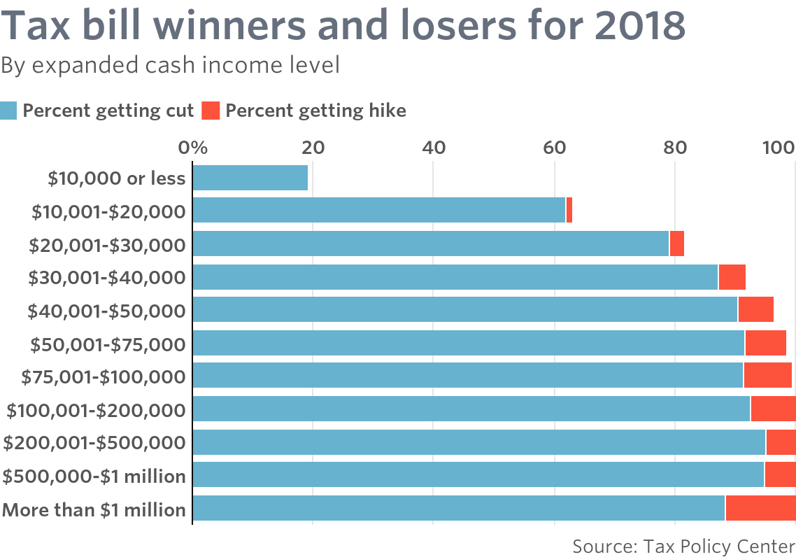 Summary of impacts of the new law by income level. Almost everyone will see the same or more often lower taxes for 2018.