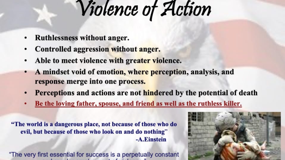 Aside from directly quoting Hitler three times advocating officers use “ruthless” violence and be a “ruthless killer” and quoting Mein Kampf : “The very first essential for success is a perpetually constant and regular employment of violence”, the closing slide of the training states “Über Alles” in large text, a phrase that is associated with nationalism and Nazis in Germany.